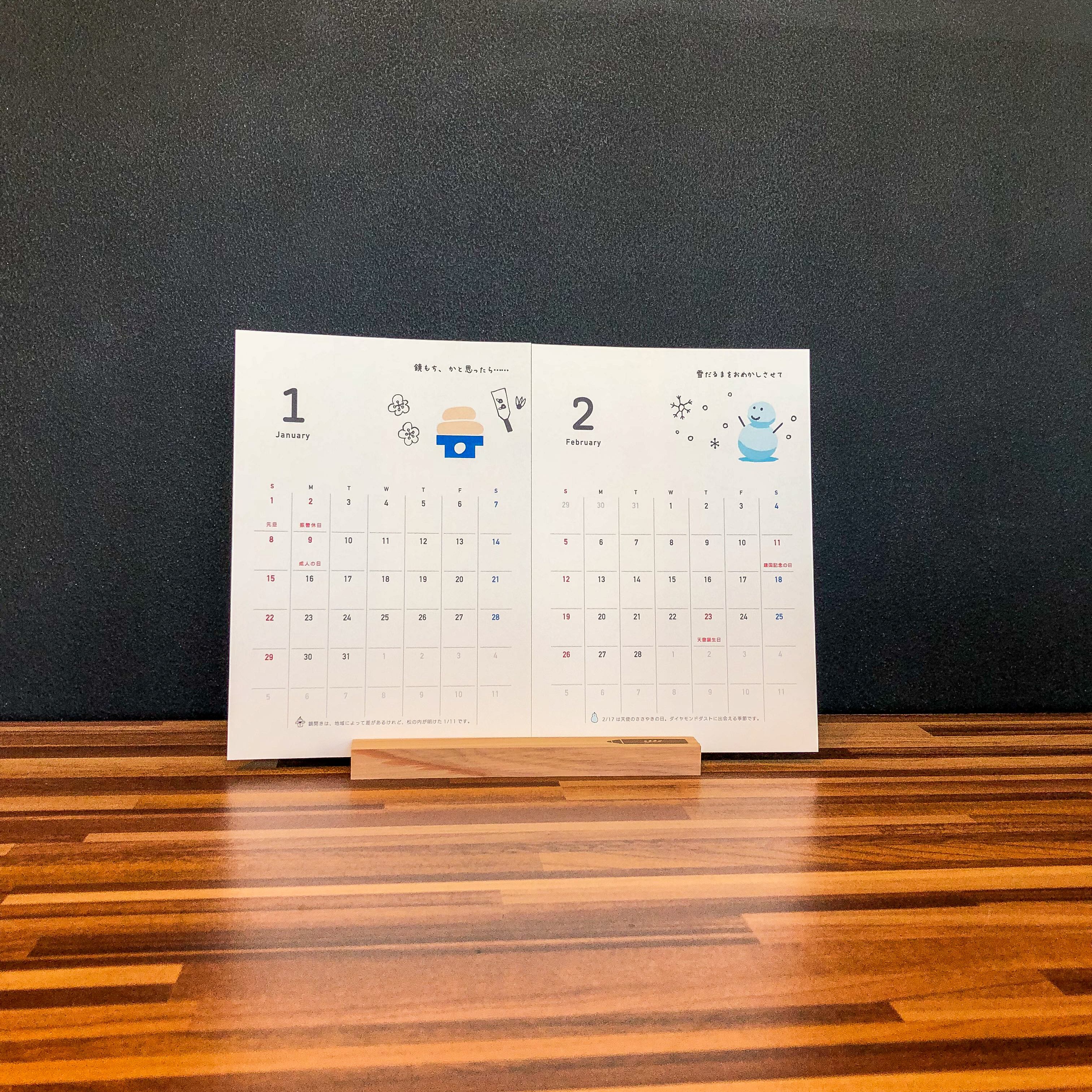 デスクに置ける卓上タイプのカレンダー。B6サイズのスリムな縦型なので、2ヶ月分を並べて置くこともできます。オフィスのデスクや自宅の玄関やキッチンなど、場所を取らずに置けます。
